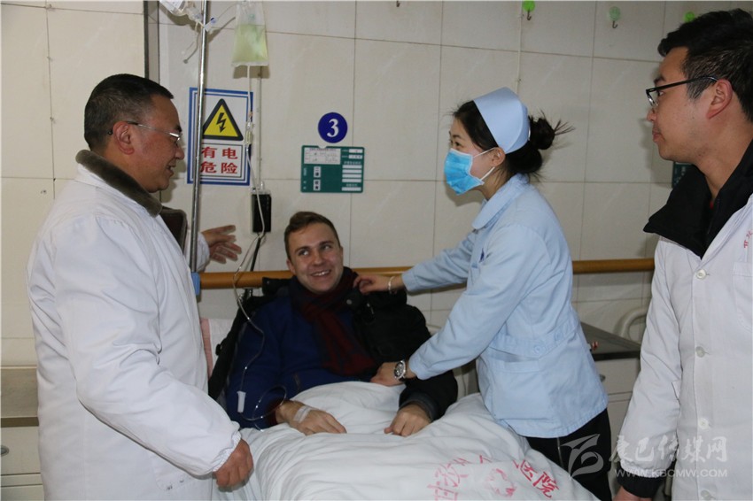 和國(guó)醫(yī)生正在給臨床病人檢查病情。一位來(lái)康定玩的俄羅斯小伙因患重感冒住進(jìn)了急救中心。正在輸液的他用比較熟練的中文激動(dòng)地告訴記者:“這里的醫(yī)生服務(wù)很好,他們過年都沒有休息,我得了重感冒,經(jīng)過治療以及在他們的細(xì)心關(guān)照下,我的病情好多了。”