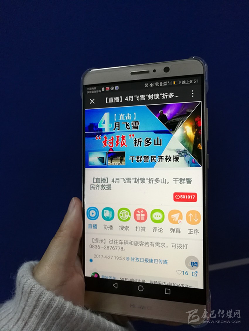 一路上,記者通過甘孜日報(bào)微信平臺,將救援情況和群眾的實(shí)況,第一時間進(jìn)行了直播。隨著一條條現(xiàn)場圖片、文字和視頻的及時發(fā)布,人們第一時間得知了折多山受困車輛和群眾得到救助的實(shí)際情況,人們紛紛在直播平臺留言,為交通、路政和當(dāng)?shù)攸h委、政府的救援行動點(diǎn)贊。在對折多山強(qiáng)降雪和受堵現(xiàn)場進(jìn)行直播報(bào)道的同時,甘孜日報(bào)社還利用直播平臺,回顧了折多山道路交通難的歷史,并再次發(fā)布雅康高速修建、折多山隧道立項(xiàng)等重大交通建設(shè)工程的進(jìn)展情況,又對此次折多山風(fēng)雪阻斷道路交通,導(dǎo)致車輛和人群滯留的特殊原因進(jìn)行了報(bào)道和澄清,并報(bào)道了風(fēng)雪中仍有不少徒步游客繼續(xù)甘孜之旅的情況,第一時間讓更多的人了解到,飛雪并未對道路造成致命影響,甘孜州的道路交通狀況和應(yīng)急處置能力已經(jīng)得到了極大的提升,完全有能力保障人們出行以及生命、財(cái)產(chǎn)安全。