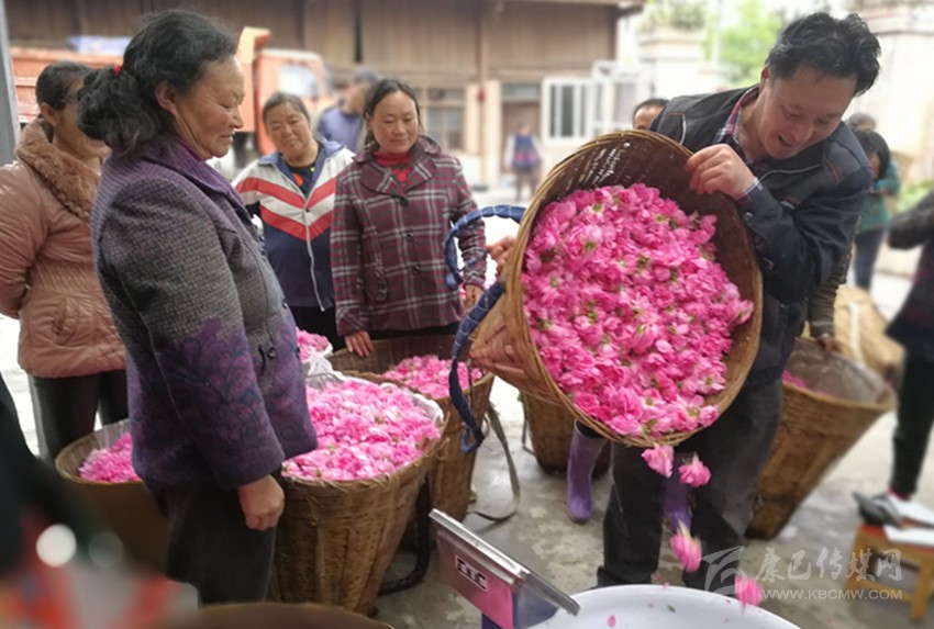 16日上午,小雨停了下來,趕在太陽出來之前采摘的玫瑰花出油率好,是采摘的黃金時間。在燕子溝鎮(zhèn)新龍門子村生產(chǎn)加工點,周邊農(nóng)戶將采摘的粉色玫瑰花瓣過秤,逐筐倒進特定的堆放地點,農(nóng)戶們也收到了應(yīng)得的勞務(wù)收入,空氣中彌漫著一股玫瑰花特有的芳香和浪漫,也充滿了當?shù)匕傩招腋:吞鹈鄣奈兜馈?/span>