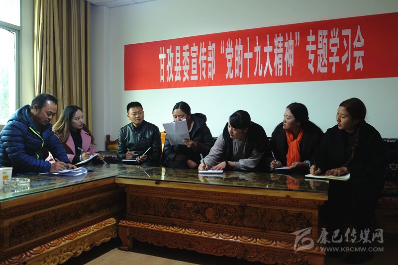 本網(wǎng)訊 (則瑪拉姆 文/圖)連日來,甘孜縣依托中心組、干部講堂、“三級三講”等學(xué)教平臺,圍繞“黨的十九大精神、《中國共產(chǎn)黨章程(修正案)》、習(xí)近平新時代中國特色社會主義思想、決勝全面建成小康社會”四大專題開展學(xué)習(xí),采取專家輔導(dǎo)講、專題研討學(xué)、集中考學(xué)評等形式,迅速組織廣大黨員干部原原本本學(xué)、聯(lián)系實際學(xué)、突出重點學(xué),切實把黨的十九大精神轉(zhuǎn)化為謀劃發(fā)展的思路、促進發(fā)展的舉措、領(lǐng)導(dǎo)發(fā)展的能力和推進發(fā)展的合力。圖為11月6日下午,縣委宣傳部組織全體職工專題學(xué)習(xí)黨的十九大精神。