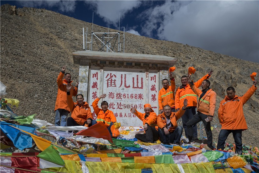 該做的活路做完了,9個人再一次來到山埡口那個立有標牌的地方,為他們每一個人拍下了一張紀念照,他們說雀兒山將不會再有道班房了,這張照片就是他們永遠的紀念。說完他們從懷中掏出才從山下買來的龍達,這是藏族人民驅(qū)災祈福的信物,迎著呼呼的大風,揚手拋上了藍天。不知是誰發(fā)出了哭聲,于是9個人都哭了,9個漢子的哭聲在5050米的高度揮撒開來是何等的豪邁!