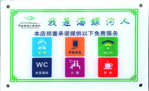 “我們長征大酒店在提高服務(wù)質(zhì)量的同時也掛了這個牌子,我們承諾為客人提供免費的開水、充電、共享廁所等服務(wù),讓客人對海螺溝有一個美好的印象,在海螺溝過的開心愉快?!遍L征大酒店負責(zé)人楊德黎說。