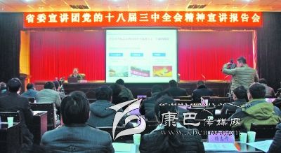 12月25日,省委宣講團在海螺溝景區(qū)宣講黨的十八屆三中全會精神,由省委講師團教授韓旭作宣講,海螺溝景區(qū)景區(qū)管理局、磨西鎮(zhèn)、新興鄉(xiāng)副科實職以上干部,21個行政村村兩委班子成員,部份州、縣人大政協(xié)代表,離退休同志代表和三老干部代表,省州屬各派駐機構負責人以及部分旅游企業(yè)負責人聆聽了報告。圖為報告會現(xiàn)場。(李娟 攝影報道)