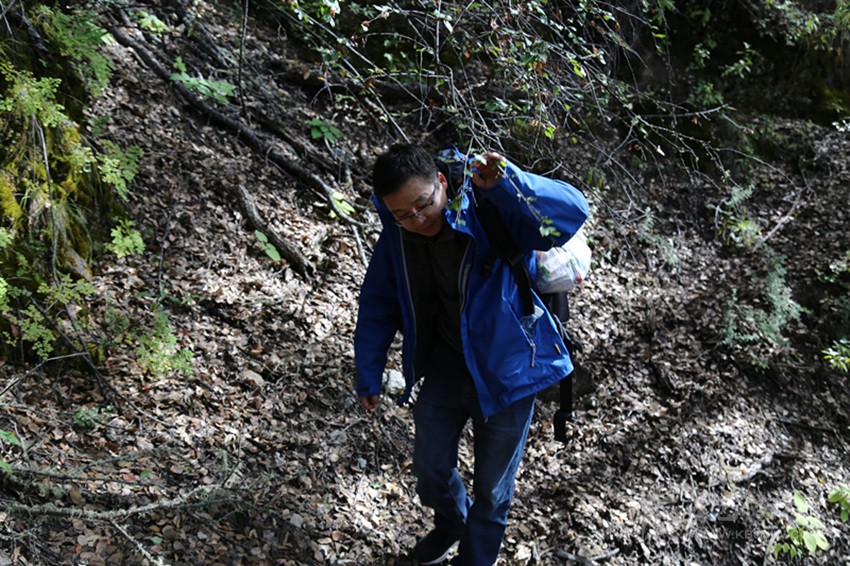 前方報道組組員余秋林穿行在樹林中。