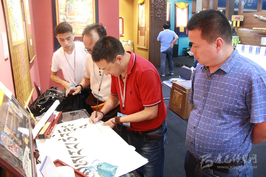 本屆文博會,巴松鄧珠帶來了一件藏文書法作品《格薩爾王》,讓現(xiàn)場觀眾嘖嘖稱贊。孫先生說:“把書法作品用藏族唐卡藝術(shù)的裝裱方式來裝裱,真讓我開了眼界。這件作品圖文并茂,真是太棒了,讓我覺得甘孜這個(gè)地方特別神圣,令人向往。我以后有機(jī)會不僅要好好練習(xí)藏文書法,還要去甘孜旅游。”