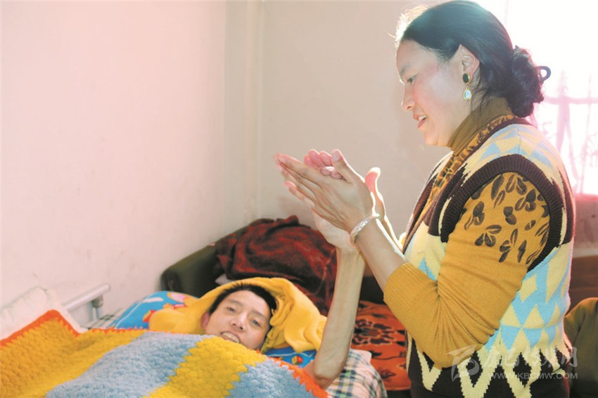 因?yàn)楦q的意外事故,家里沒(méi)有了經(jīng)濟(jì)來(lái)源。巨大的經(jīng)濟(jì)壓力,讓白措喘不過(guò)氣來(lái)。但她沒(méi)有向命運(yùn)低頭,撫育3個(gè)孩子,就近務(wù)工掙錢補(bǔ)貼家用。同時(shí),利用工作間隙回家,照顧丈夫吃飯,給他翻身,換洗沾滿屎尿的墊布……因?yàn)閾?dān)心丈夫久臥生褥瘡和肌肉萎縮,白措每隔3小時(shí)就要給丈夫翻身,還自學(xué)了一套按摩手法替根絨全身按摩。在她的精心照料下,根絨身體慢慢得到了康復(fù)。