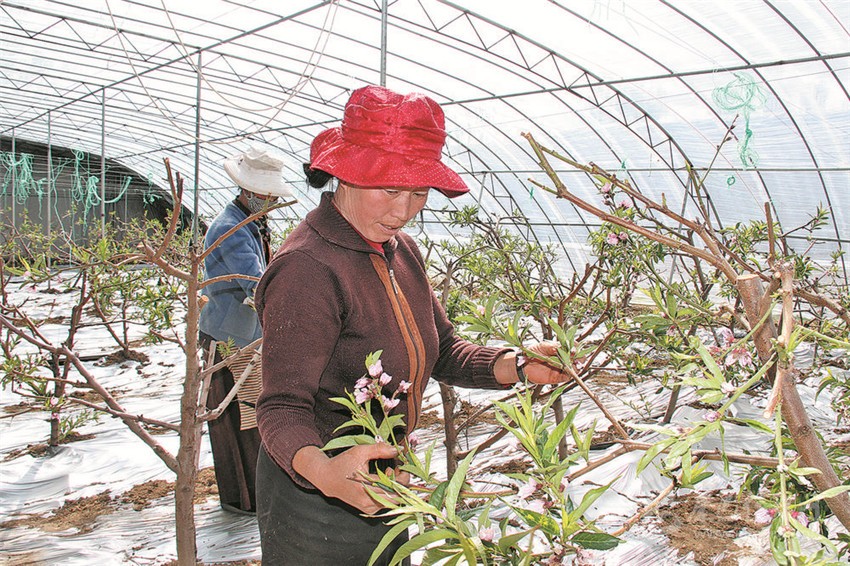 圖為當地務工農牧民正在給高原大棚桃樹疏枝。
