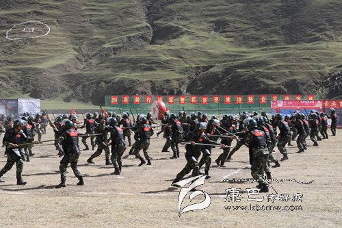 在實(shí)戰(zhàn)技能演練中,各單位都表演了自己的拿手絕技:由武警甘孜州支隊雪山飛虎隊20名官兵演練的特種射擊;武警四川總隊第二支隊演練的格斗術(shù);中國人民解放軍甘孜軍分區(qū)獨(dú)立營120名官兵演練刺殺操;武警甘孜支隊一大隊和三大隊200名官兵演練的防暴對抗;雪山飛虎隊隊員帶來的硬功表演;州公安局特警支隊特警演練的“雪狼十七式”、摔擒配套動作、實(shí)戰(zhàn)對抗。據(jù)了解,“雪狼十七式”是甘孜公安特警通過六年來在高原維穩(wěn)駐訓(xùn)、處置突發(fā)事件,摸索出來的摔擒動作,具有極強(qiáng)的殺傷力,能瞬間制敵。它是我州特警隊員實(shí)戰(zhàn)中克敵制勝的法寶,是特警隊員必備的基本功。