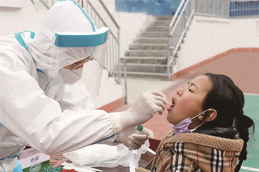 圖為醫(yī)護人員正在為學生做核酸檢測。