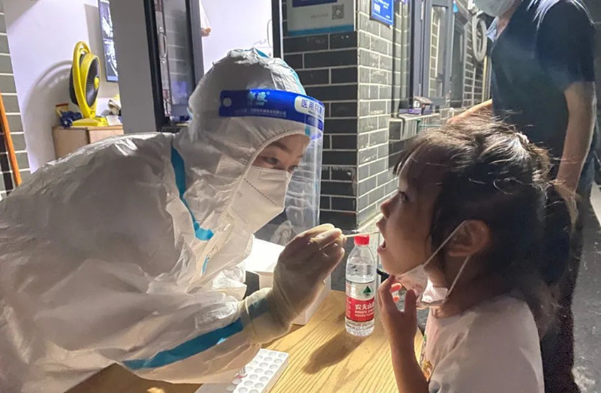 圖為醫(yī)務(wù)人員正在開(kāi)展核酸檢測(cè)采樣。