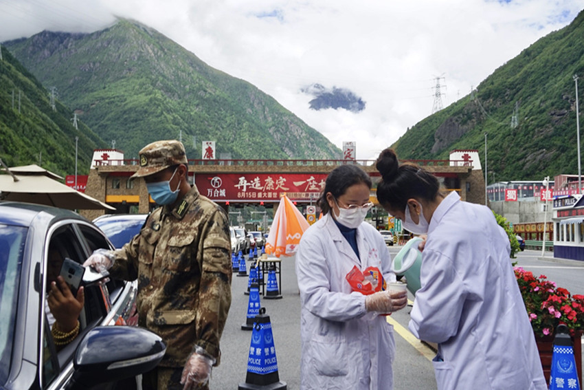 地震又遇疫情。大量救援隊進(jìn)入災(zāi)區(qū),加大了當(dāng)?shù)匾咔榉揽氐膲毫?。為減輕當(dāng)?shù)胤酪邏毫Γ?月6日,州藏醫(yī)院再次抽派8名醫(yī)務(wù)人員組成兩支核酸采樣隊,奔赴瀘定縣得妥鎮(zhèn)火線支援疫情防控工作。核酸采樣隊到達(dá)目的地后,在應(yīng)急指揮部的安排下,迅速投入到了緊張有序的采樣工作中。截止撤離時,共為當(dāng)?shù)亻_展了1萬余人次的核酸采樣。