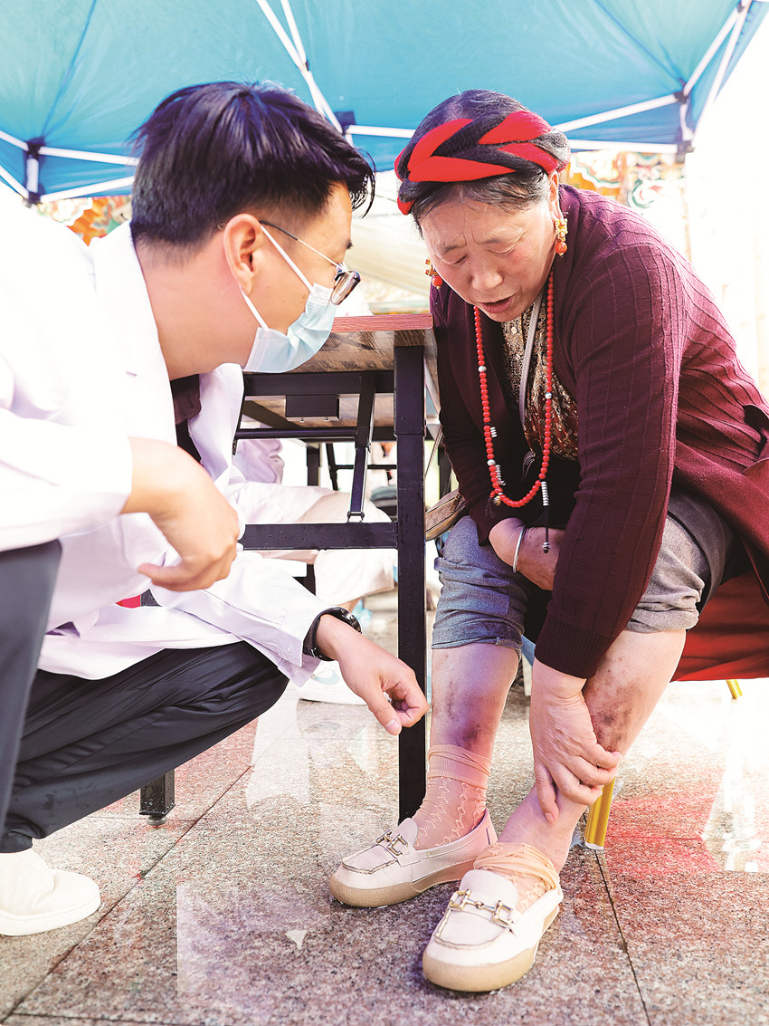排隊、分診、診斷……在巴塘縣義診現(xiàn)場,每一位身著白衣、口音輕柔的醫(yī)生面前都有數(shù)名等待問診的群眾。來自北京大學(xué)第一醫(yī)院、解放軍第八醫(yī)學(xué)中心、北京航天總醫(yī)院等醫(yī)療機(jī)構(gòu),涵蓋腎臟、中醫(yī)、骨科、肝病科疾病等多個領(lǐng)域的專家團(tuán)隊正為前來問診的群眾提供多學(xué)科專業(yè)義診服務(wù),并就常見疾病耐心細(xì)致地為患者及家屬答疑解惑。