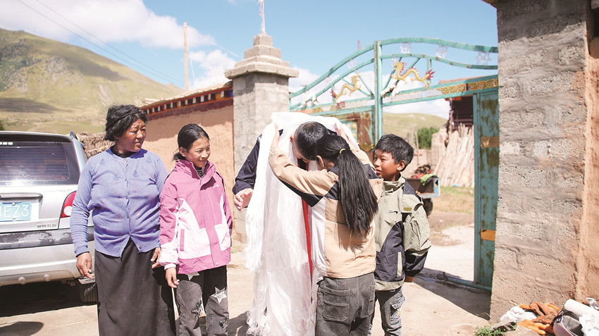 早晨8時(shí)出發(fā),11點(diǎn)半才抵達(dá),中扎科鎮(zhèn)是德格縣最偏遠(yuǎn)的鄉(xiāng)鎮(zhèn)。向三仟一下車,呷措便捧著哈達(dá),眼含熱淚迎了上來(lái),施以藏族最高禮儀——碰頭禮來(lái)敬獻(xiàn)哈達(dá),她的姐姐也不斷道著感謝:“當(dāng)時(shí)醫(yī)生從她肚子里取出的腫瘤和感染包蟲(chóng)的組織加一起快有二十斤了,要不是你,她當(dāng)年怕就沒(méi)命了!”向三仟回憶起此事也是感觸頗多,輕輕拍拍呷措的肩膀,鼓勵(lì)著:“你命大,肯定沒(méi)事,以后福氣還多著呢!”