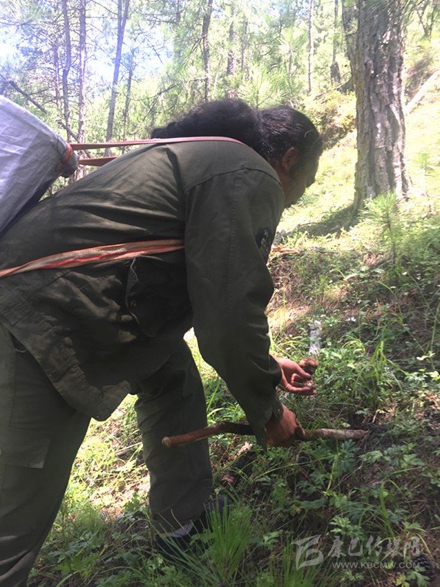 村民康扒珠正在采摘松茸。