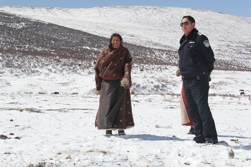 得知這一情況,王志剛和幾個(gè)民警帶上急需物資,騎著摩托車前去救援。雪太大,半路上,王志剛和戰(zhàn)友不得不放棄摩托車,每人背著幾十斤物資,踏著齊膝大雪,徒步4個(gè)多小時(shí),及時(shí)將救命物資送到。臨走時(shí),王志剛給牧民留下幾百元錢。