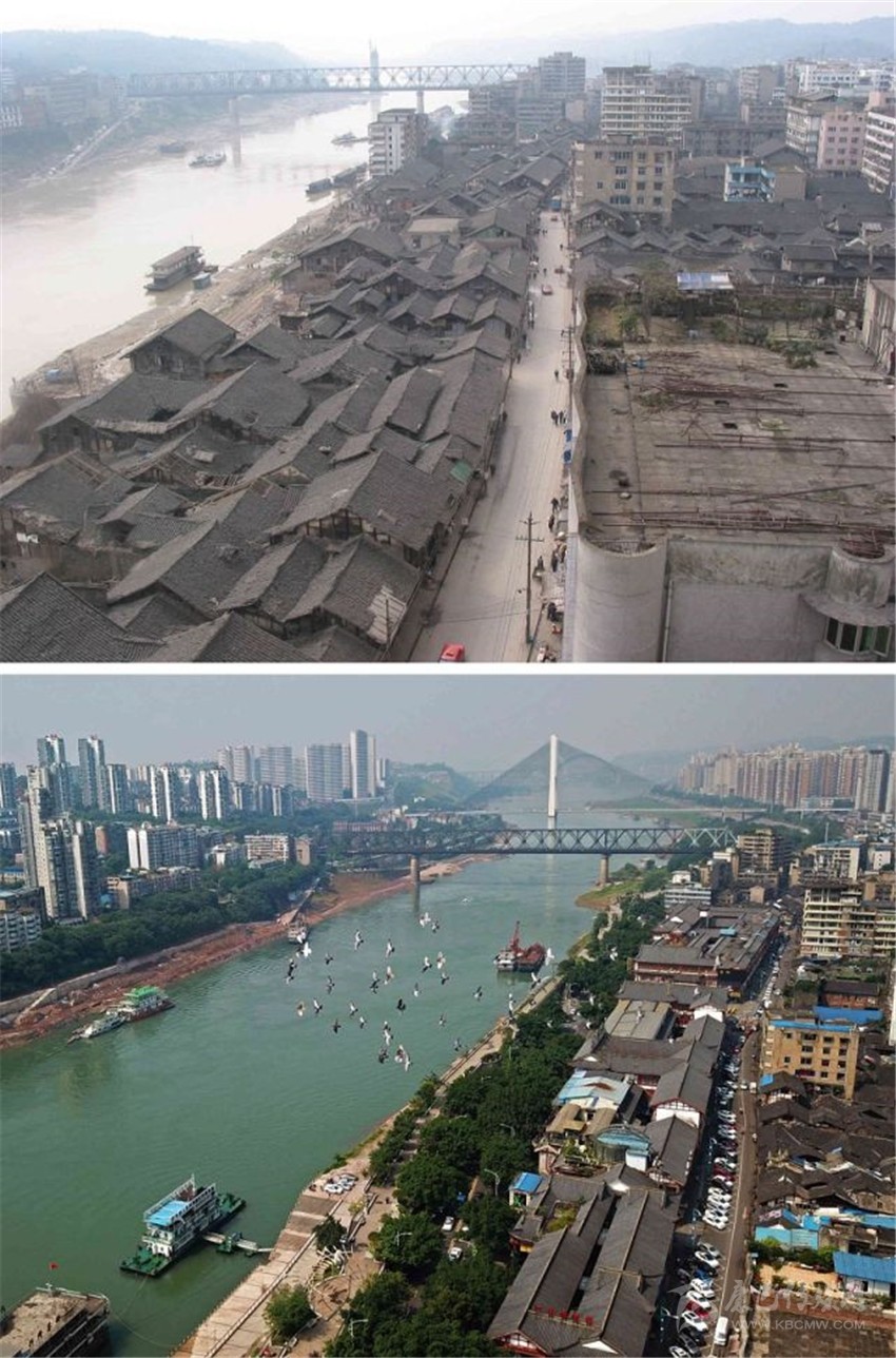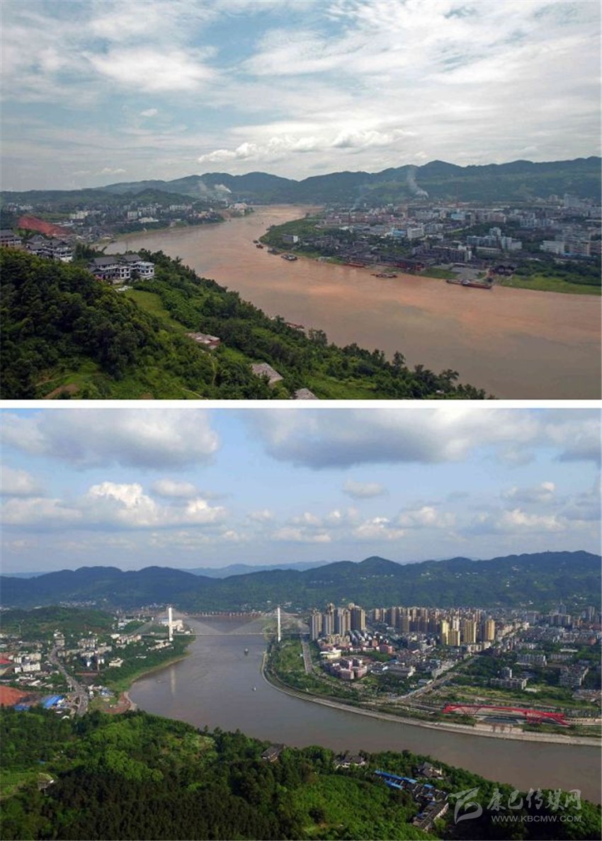 拼版圖片:上圖為2014年7月拍攝的宜賓市南溪區(qū)兩岸江景;下圖為2016年4月在同一視角拍攝的畫(huà)面。新華社發(fā)(曾朗攝)