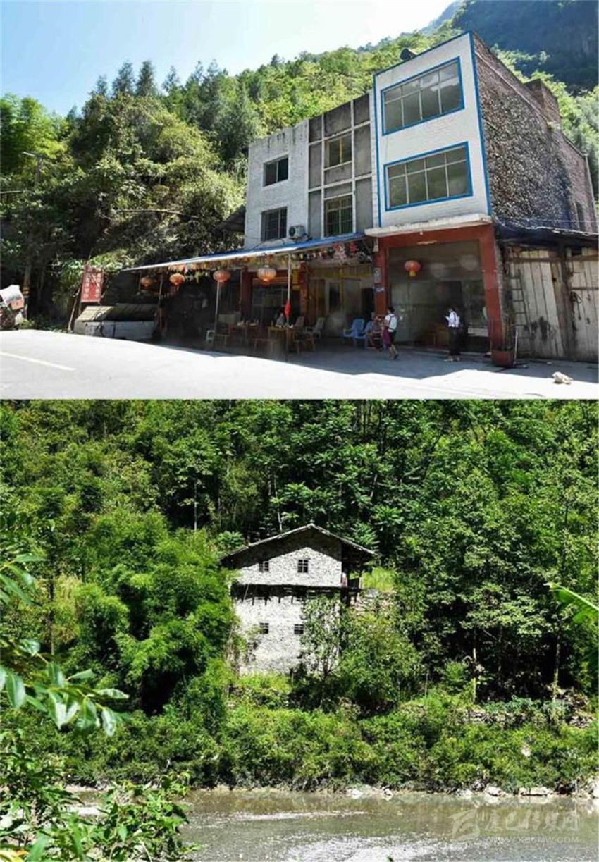 朱國(guó)富家的老屋(下)和現(xiàn)在居住的房子——家、店合一的“黑灣魚莊”。張可凡攝。