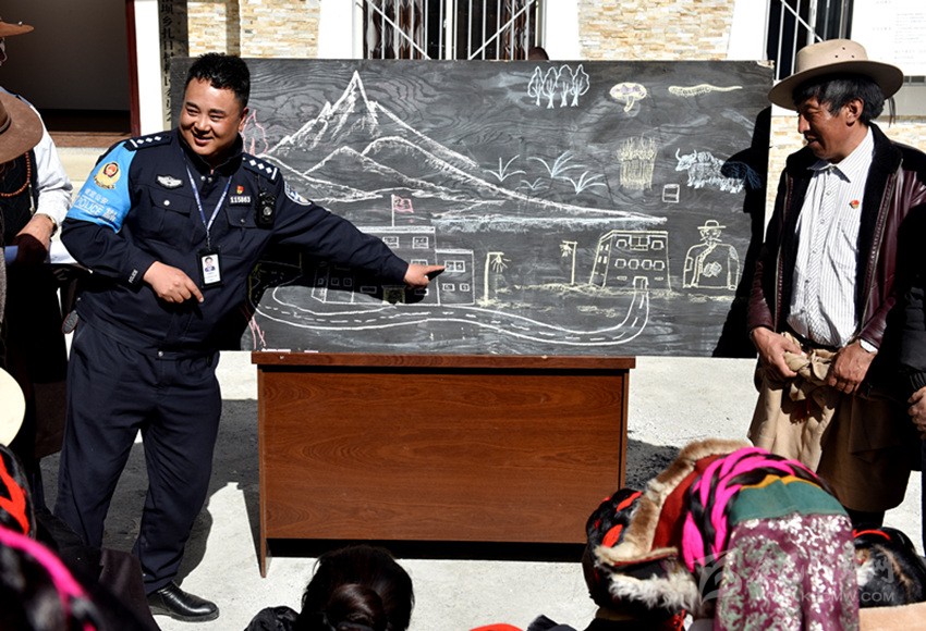 由于轄區(qū)藏族群眾大多都不識(shí)漢字、不會(huì)漢語,巴桑呷瓦便將自己的繪畫技藝運(yùn)用到普法教育中,2018年10月,康定市公安局在對(duì)聯(lián)系鄉(xiāng)甲根壩開展精準(zhǔn)扶貧工作時(shí),在全市范圍內(nèi)抽調(diào)了巴桑呷瓦等10名富有群眾工作經(jīng)驗(yàn)的民警,他一邊負(fù)責(zé)沙德鎮(zhèn)派出所日常工作,一邊負(fù)責(zé)兼職扎日村精準(zhǔn)扶貧工作,用繪畫的方式為牧民群眾描繪脫貧致富夢(mèng)。他把國(guó)家的相關(guān)法律法規(guī)、民族政策和惠民工程政策吃透并制作成故事性強(qiáng)、通俗易通的簡(jiǎn)筆畫冊(cè)向老百姓解讀、宣講。在巴桑呷瓦妙趣橫生、詼諧幽默的“授課”下,深?yuàn)W的法律政策變得淺顯易懂?!八漠嬓蜗笊鷦?dòng),接地氣,有我們的生產(chǎn)生活場(chǎng)景,我們喜歡看,他的講解幽默風(fēng)趣,我們聽得懂,只要他一下來,村民都圍在他的身邊,舍不得離開?!痹沾宓拇迕褚呀?jīng)把這位“畫家”警察當(dāng)作了自家人。