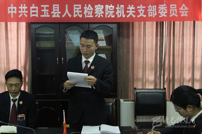 本網(wǎng)訊 近日,白玉縣人民檢察院黨支部召開接收預備黨員大會,討論了關于吸收秦偉同志為中共預備黨員的事宜。會議由該院黨支部書記王洪勇同志主持,除2名黨員抽調(diào)外出,該支部12名黨員、1名發(fā)展對象參加此次會議,2名黨外干部列席。