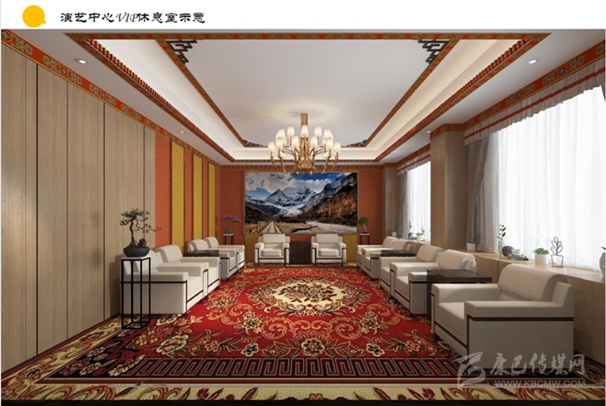 藏式繪畫、門板藏式浮雕造型、藏式鼓架、展示康定城的浮雕........記者看到,效果圖中農(nóng)牧民演藝中心的設(shè)計(jì)充滿了“傳統(tǒng)文化”的味道。頂部設(shè)計(jì)利用了線條的柔韌性和律動(dòng)性,使空間更有線條感,看起來像康定的潺潺河流,墻面分別使用樂器、山巒疊成的變化形式,營(yíng)造出獨(dú)特的民族風(fēng)情。通過自熱和人文的結(jié)合展示出康定人民樂觀向上、民族團(tuán)結(jié)的和樂畫面。地面設(shè)計(jì)采用了暖(冷)色座椅與富有民族特色的色彩搭配,營(yíng)造出一種身處藏家,暢游藏文化海洋的意境。