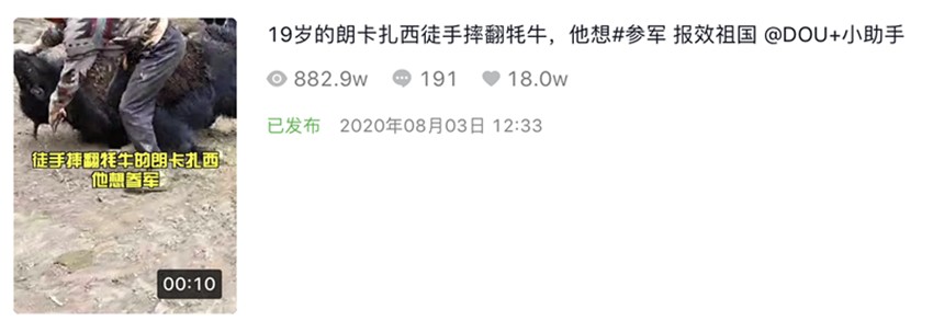 8月3日,這段僅有10秒長(zhǎng)的視頻,在抖音短視頻平臺(tái)《甘孜日?qǐng)?bào)》康巴傳媒抖音號(hào)發(fā)布后,短短一天內(nèi)獲得了800多萬(wàn)次播放量,200多名網(wǎng)友留言評(píng)論,18萬(wàn)次點(diǎn)贊更是“宣告”其正式成為“網(wǎng)絡(luò)爆款”。