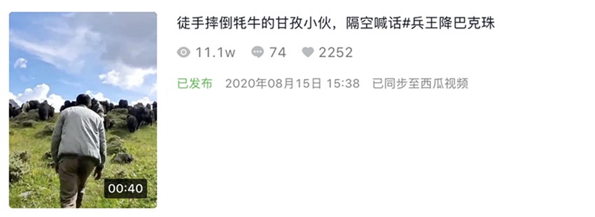 “啪!”一頭強(qiáng)壯的牦牛應(yīng)聲倒地。此后,就有了郎卡扎西一次次摔倒牦牛的精彩視頻。