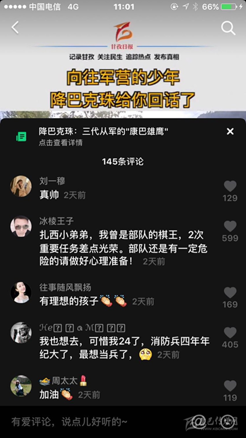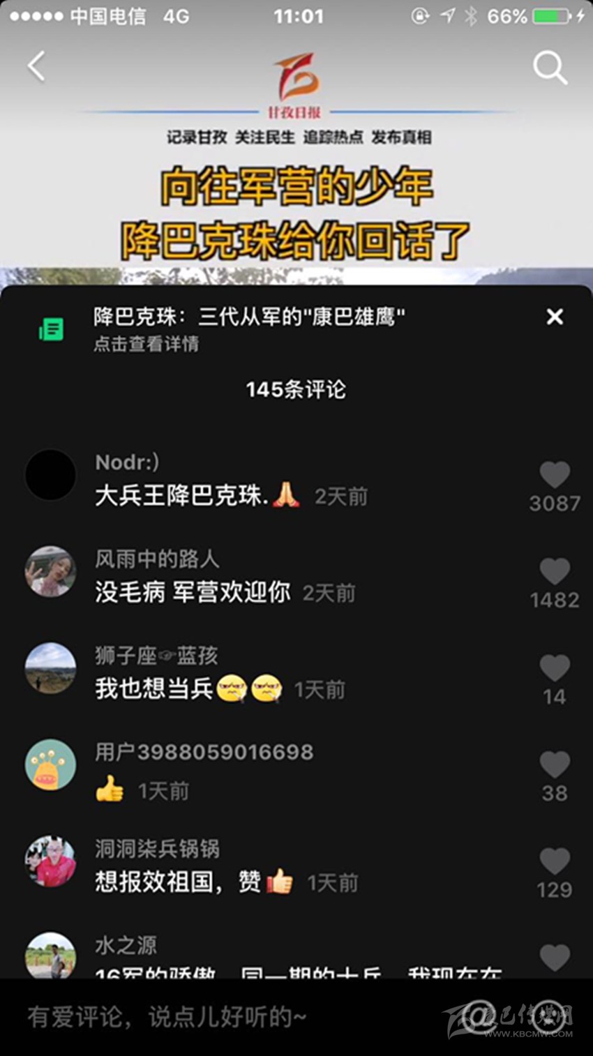 三段視頻,六百多條留言,近兩千萬(wàn)次播放,一個(gè)藏族少年的軍旅夢(mèng)在網(wǎng)絡(luò)上熱烈綻放,而農(nóng)牧區(qū)許多青年的軍旅夢(mèng)也就此被點(diǎn)燃,忠勇大愛(ài)的“血脈”在康巴高原傳承! (本網(wǎng)記者 肖宵 整理)