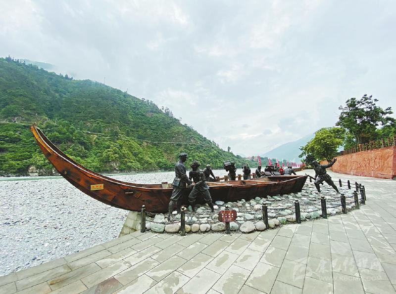 不遠(yuǎn)處的安順場渡口、大渡河邊,矗立著一座“紅軍渡”石碑,上面的三個鮮紅大字由渡河時任第一軍團(tuán)第一師一團(tuán)團(tuán)長楊得志題寫。石碑旁陳列著的一艘長10.5米、寬2.3米、高2.2米的“紅軍船”,正是當(dāng)年紅軍強(qiáng)渡大渡河時使用的翹首木船復(fù)制品。木船旁,是戰(zhàn)士和當(dāng)?shù)卮兿蚰敬\(yùn)送武器裝備的雕像,斜坡上,勇士隊伍正奔向渡口。