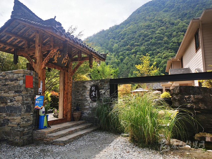 走過(guò)碎石鋪就的院壩,幾株狗尾巴草隨風(fēng)搖曳,再穿過(guò)古韻十足的大門,同堂溫泉民宿的故事正式啟幕。