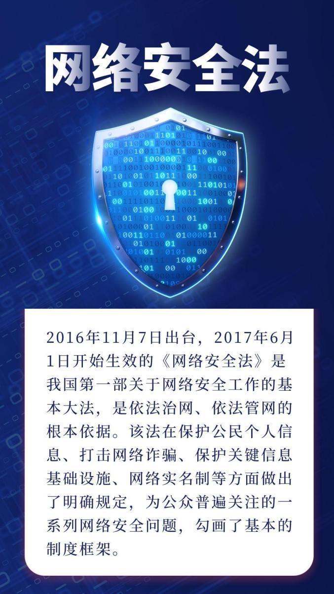 《中華人民共和國網(wǎng)絡(luò)安全法》是為保障網(wǎng)絡(luò)安全,維護(hù)網(wǎng)絡(luò)空間主權(quán)和國家安全、社會(huì)公共利益,保護(hù)公民、法人和其他組織的合法權(quán)益,促進(jìn)經(jīng)濟(jì)社會(huì)信息化健康發(fā)展而制定的法律?!吨腥A人民共和國網(wǎng)絡(luò)安全法》由中華人民共和國第十二屆全國人民代表大會(huì)常務(wù)委員會(huì)第二十四次會(huì)議于2016年11月7日通過,自2017年6月1日起施行。