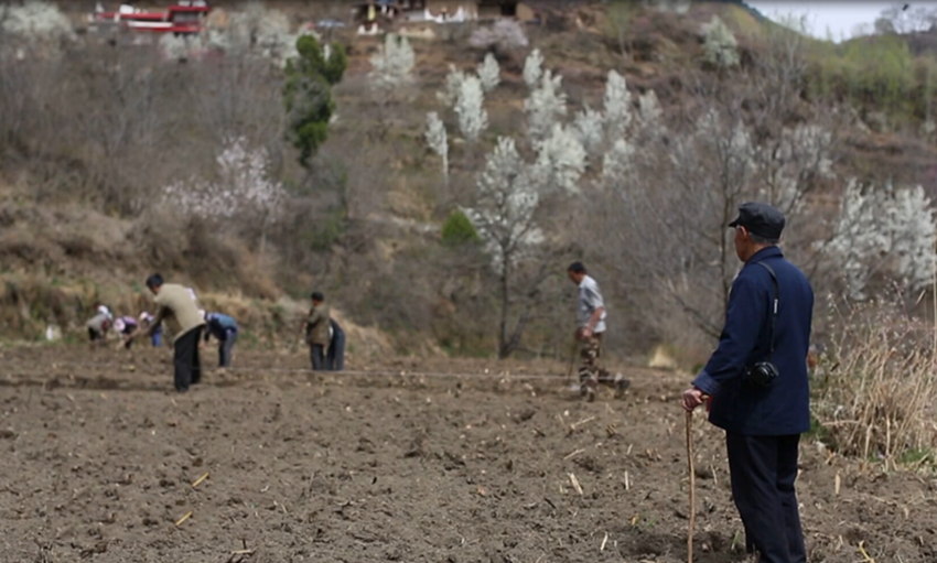 張時達老人(中)在田間查看作物生長情況。