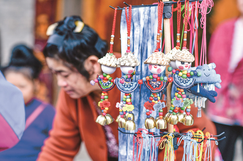 在貴州省黎平縣肇興侗寨,侗族群眾在侗年年貨集市銷售文創(chuàng)產(chǎn)品。