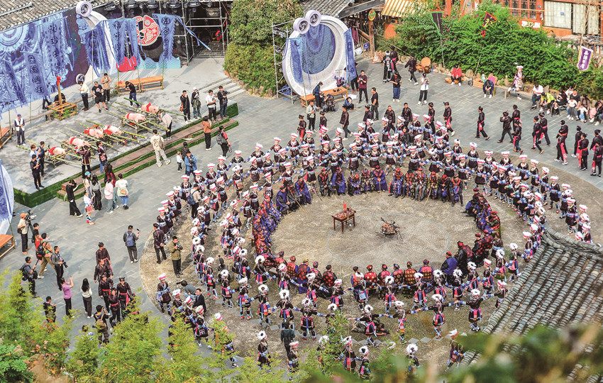 在貴州省黎平縣肇興侗寨,侗族群眾身著節(jié)日盛裝參加侗年踩歌堂活動(dòng)。
