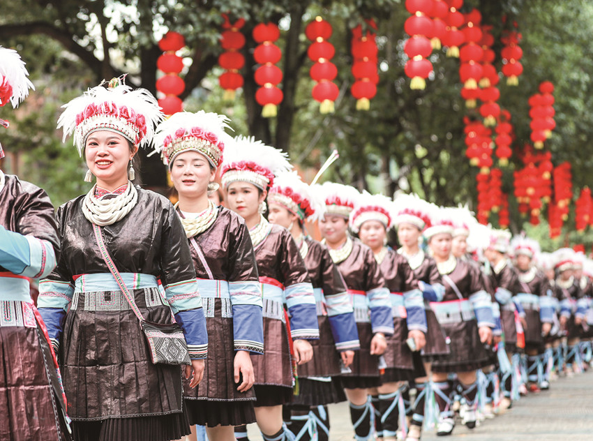 在貴州省黎平縣肇興侗寨,侗族群眾身穿節(jié)日盛裝參加侗年巡游活動(dòng)。