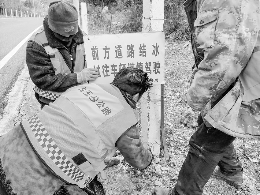 冬季氣溫下降,在夜晚形成結(jié)冰現(xiàn)象,易造成汽車打滑,難以控制,對(duì)過往車輛安全造成極大威脅。白玉公路分局出動(dòng)人員 450 人、 車輛72輛次,對(duì)管養(yǎng)轄區(qū)道路全線進(jìn)行警示牌的安裝。同時(shí),對(duì)有暗冰、陰山積雪等路段及時(shí)拋灑防滑沙和融雪劑,確保道路行駛安全。