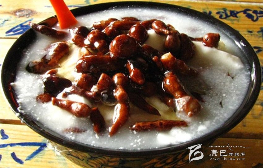 人參果飯也叫“卓瑪折絲”。將人參果煮熟后,放在米飯上面,細(xì)細(xì)地撒些白糖,再均勻地淋上一勺滾燙的酥油汁,一份營養(yǎng)又好吃的人參果飯就做好了。人參果飯被藏族同胞視為一種吉祥的食物,只在婚禮、節(jié)日食之,以之待客,視為尊貴之意。在隆重的藏歷新年,人參果飯會(huì)被盛在一個(gè)小巧精致的盛器內(nèi),供于佛龕前。