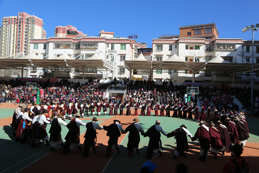 弦音聲動(dòng)鬧新年,紅綾長(zhǎng)袖舞春風(fēng),千人弦子鍋莊,唱出龍年大團(tuán)圓,踏出幸福新舞步……2月13日,在巴塘縣全民健身活動(dòng)中心舉行的春節(jié)暨藏歷新年系列活動(dòng)“文化·點(diǎn)靚生活”——巴塘縣五彩藏鄉(xiāng)藝術(shù)周弦子鍋莊展演活動(dòng)現(xiàn)場(chǎng)喜氣洋洋、人頭攢動(dòng),上千名群眾身穿節(jié)日盛裝,拉起弦胡,載歌載舞,共同慶祝新春佳節(jié),祈盼龍年國(guó)泰民安、風(fēng)調(diào)雨順。圖為活動(dòng)現(xiàn)場(chǎng)。 敖梅 李穎/文 格桑澤仁/圖