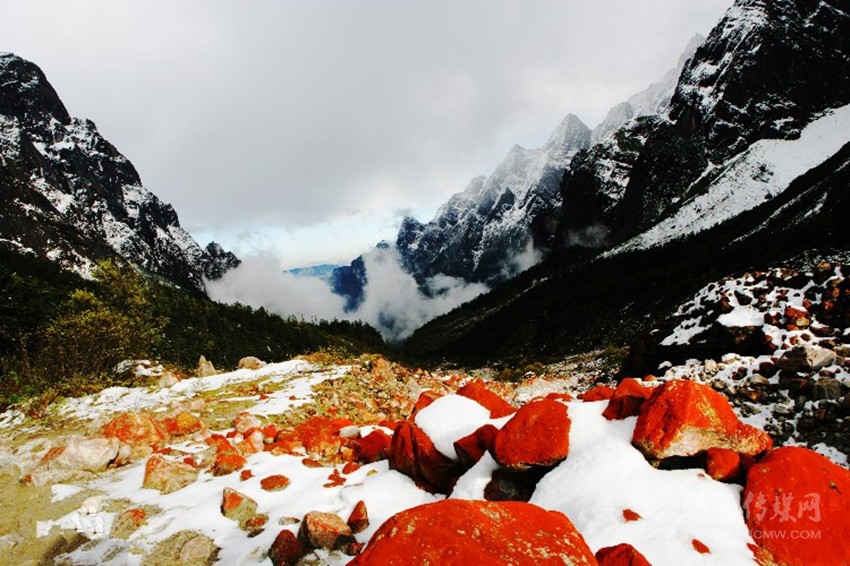 燕子溝最精華的景觀是紅石灘,此處為亞洲最大的紅石灘。石頭上布滿的紅色物質(zhì),是一種微生物,在高山特有的生態(tài)環(huán)境內(nèi)得以繁衍,構(gòu)成生命與歷史相融共存的奇特景觀。因?yàn)樯碁├锏氖^都長(zhǎng)了一層紅色的苔蘚,就好象沙灘里的石頭都穿上了喜慶的紅衣,使得燕子溝成了顏色的世界。據(jù)說只有在空氣質(zhì)量很好的情況下,這種苔蘚才能夠生存,曾經(jīng)有研究院的科學(xué)家為將這種石頭帶出去研究,結(jié)果剛下飛機(jī),發(fā)現(xiàn)石頭上的紅色退了,因?yàn)榭諝赓|(zhì)量不好,導(dǎo)致石頭上的苔蘚無法生存。